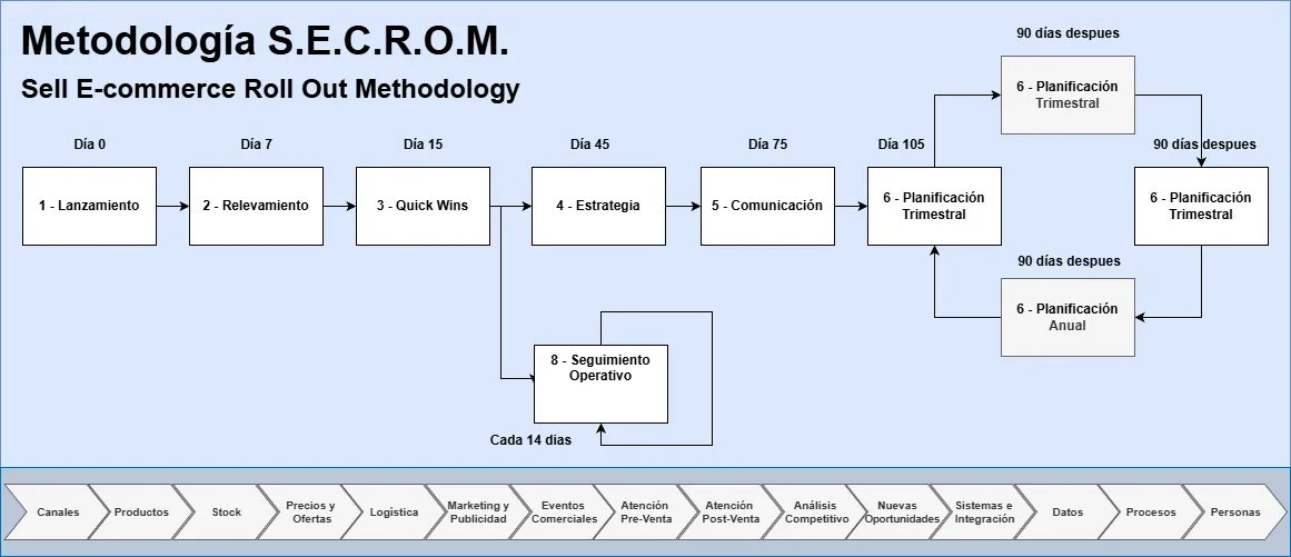 Por eso hemos desarrollado nuestra propia metodología de trabajo: S.E.C.R.O.M. (Sell E-commerce Roll Out Methodology). Este sistema probado nos permite organizar el trabajo y centrarnos en las prioridades que te llevarán a tus objetivos.